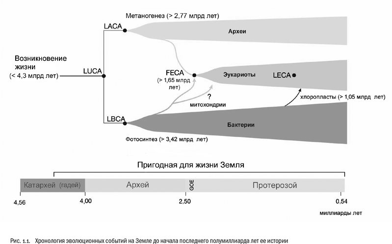 Автор обзора, бельгийский палеобиолог Эммануэль Жаво, иллюстрирует свою статью небольшим рисунком, где наглядно представлены важнейшие этапы ранней истории биосферы, наложенные на шкалу геологического времени. Я привел этот рисунок здесь (рис. 1.1), немного его упростив и переведя часть терминов с английского языка на русский.