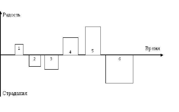 Пример сменяемости страданий и радостей в жизни: ребенок (мальчик) в определенном возрасте начинает ходить на бальные танцы и получать от этого удовольствие и радость, но спустя время, окружающие его мальчишки начинают донимать (а может даже и бить) и он перестает испытывать радость и наступает время страданий. Спустя какое-то время мальчик перестает ходить на танцы и идет в спортзал заниматься боксом и также испытывает страдания от трудностей, возникающих от занятий спортом до тех пор, пока не начинает получаться. И с этого момента наступает период радости. После, в школе одноклассники попадают под прессинг новоявленного боксера и он снова получает радость, а когда он начинает бить и старшеклассников, то к нему приходить уважение, которое он ранее не испытывал, от большинства детей, он начинает испытывать более увеличенную радость. Но с этого момента его начинают ненавидеть учителя и часть детей, от чего начинает испытывать еще более сильные страдания (взрослые способны более изощренно оказывать агрессивное давление на детей). Это можно графически изобразить на графике. Ось абсцисс будем называть осью времени, а ось ординат – уровнем эмоции (радость или страдания). Где 1 – занятие бальными танцами, 2 – прессинг мальчишек, 3 – трудности занятий боксом, 4 – успехи в боксе, 5 – уважение в детском коллективе, 6 – прессинг учителей. Но в этом графическом изображение не хватает действительных величин: продолжительности времени прошедших событий и степени эмоций.