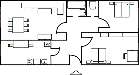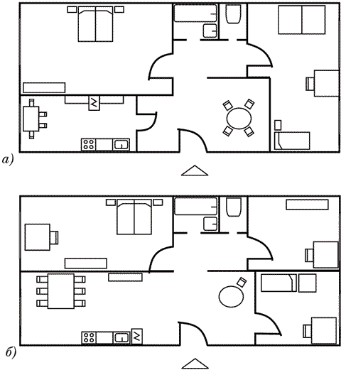 Ниже (рис. 1) продемонстрирован масштабный план квартиры, состоящей из трех комнат, на котором указаны планируемое размещение мебели и варианты перепланировки (рис. 2). Следует заметить, что при составлении плана были использованы стандартные обозначения, с помощью которых отмечают окна, балконы или лоджии, направление открывания дверей, сантехнику.