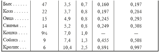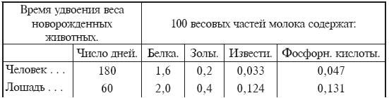 Bunge указал на состав молока, как на пример мудрой разверстки природою минеральных веществ. Относительное количество неорганических веществ в молоке млекопитающих животных различно для каждой породы и зависит от быстроты их роста. Это видно из прилагаемой таблицы, заимствованной из учебника физиологии Bunge, т. II стр. 122.