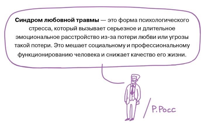 Синдром любовной травмыПервым об этом заговорил американский доктор Ричард Росс в 1999 году. В книге «Синдром любовной травмы» он обратил внимание на то, что по своим проявлениям любовные переживания похожи на посттравматическое стрессовое расстройство, а потеря романтической привязанности является для психики сильнейшим стрессом сродни шоковой травме или абстинентному синдрому. Книга выдержала множество переизданий и расширила взгляд психологов на терапию любовной травмы. Она до сих пор находит отклик у читателей по всему миру.