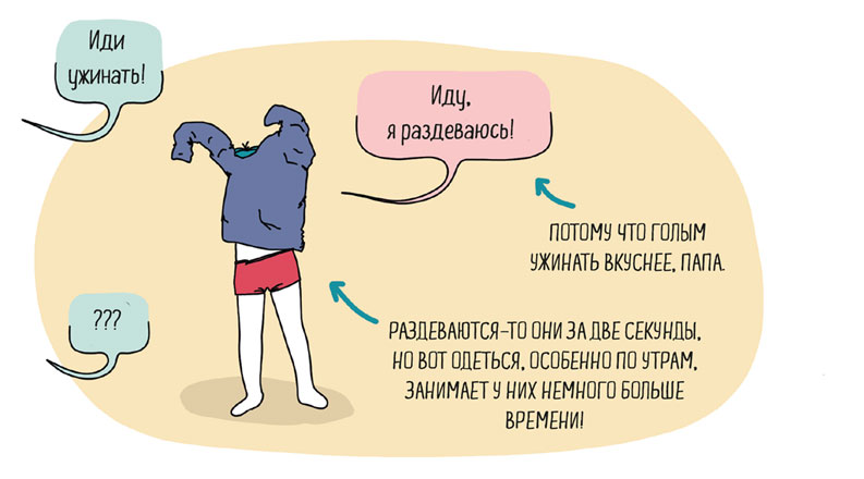 Очень возможно, что в 2 или в 3 годика ваш ребенок станет фанатом нудистского образа жизни. Вы на кухне, и вдруг мимо, как молния, пробегает счастливый маленький голопопый человек. Ходить без подгузников, должно быть, дико приятное занятие, которое вызывает чудеснейшие ощущения. Вы когда-нибудь купались в море или в бассейне голышом? Это очень классно, да? Ну вот представьте теперь, что вы это делаете после того, как несколько лет носили на себе толстые, тяжелые трусы размером больше собственной головы. «Я свободе-е-ен, словно птица в небесах…»