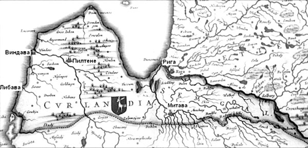 Старинная карта Курляндии. В Российской империи Митава (ныне Елгава) – столица Курляндской губернии, Либава (Лиепая) – главная военно-морская база, Виндава (Вентспилс) – незамерзающий торговый порт. После Ливонской войны (1558–1583) Пилтене была столицей Пилтенского округа в Курляндском епископстве