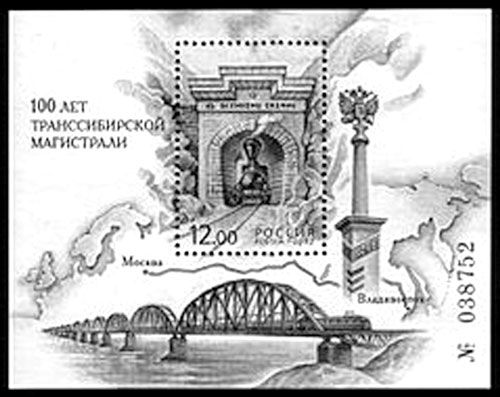 Почтовый блок России «100 лет Транссибирской магистрали», 2002. На марке блока изображен тоннель, проложенный в Яблоновом хребте (Забайкалье), с выходящим из него паровозом