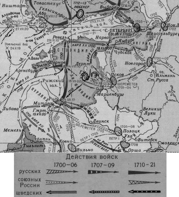 Более успешно бои со шведами проходили в устье Невы: в октябре 1702 русские войска взяли Нотебург (Орешек), в начале мая 1703 взяли Ниеншанц (находился при падении реки Охты в Неву), что и стало предпосылкой основания нового города на Неве 10 мая 1703 года. Но война со шведами продолжалась. В 1705 Петр лично повел войско в Курляндию, после семи дней осады сдалась Митава, но Ригу взять не смог. Сумей Петр взять Ригу, кто знает, может быть, Рига стала бы столицей Российской империи.