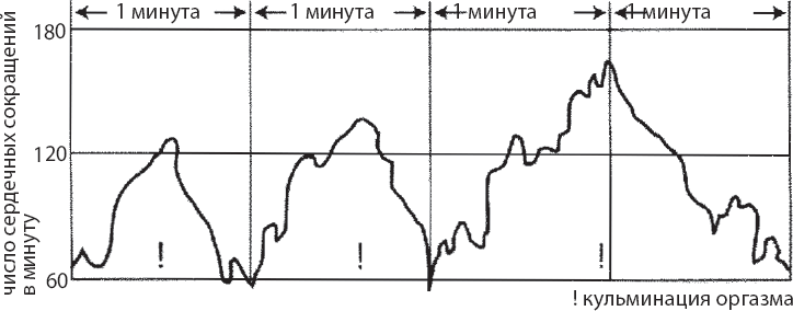 Хартман и Фитиан контролировали частоту сердечных сокращений в ходе половых актов, совершаемых этими мужчинами с партнершами в лабораторных условиях, как наиболее четкий показатель оргазмов. Обычная частота сердечных сокращений равна приблизительно 70 ударам в минуту; во время оргазма она почти удваивается, достигая 120 ударов. После оргазма сердце возвращается к своему исходному режиму (см. рис. 1).
