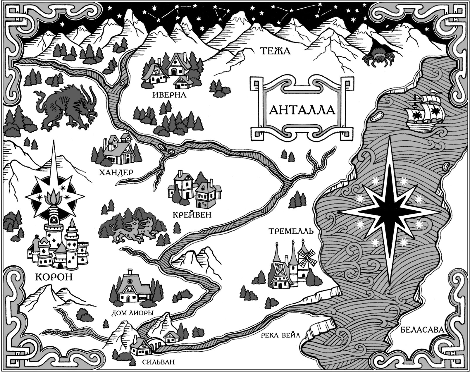 Я кивнула и поспешила к каменным ступеням, ведущим вниз, к Сильвану, который прятался в ущелье от жадных глаз речных пиратов. Надо мной, между скалами, была подвешена тяжелая железная цепь. Насколько мне известно, Сильван – это единственный городок в Анталле, а может, и во всем мире, который мог похвастаться тем, что в нем приземлилась не одна, а две падающие звезды. Фрагмент первой был переплавлен в фигуру пятиконечной звезды и свисал с цепи. Ночью эта звезда мерцала над городом.