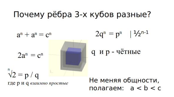 Необычайная красота и лаконичность формулировки Великой теоремы Ферма заставляют искать наглядное решение. Итак, для n ≥ 3 Пифагоровых троек найти ещё никому не удалось. Почему?