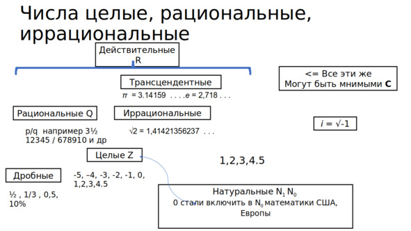 Числа натуральные, целые, рациональные, иррациональные и трансцендентальные.