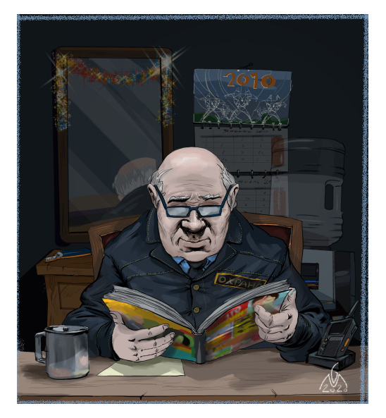 Пожилой охранник по фамилии Башмаков, или как мы его за глаза называем – Башмак, читал за своей конторкой очередной “желтый” фолиант, напечатанный на плохой бумаге, но поражавший количеством страниц. Башмак был возбужден – состояние для него непривычное.