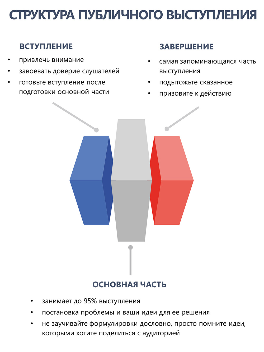 Хотя таких уроков как «риторика» у вас, скорее всего, не было в школе, но вы знаете, что произведение состоит из трех частей – вступления, основной части и окончания. Это подходит и для публичного выступления. Но в публичных выступлениях эти три части имеют свою специфику, поэтому рассмотрим, что они собой представляют.