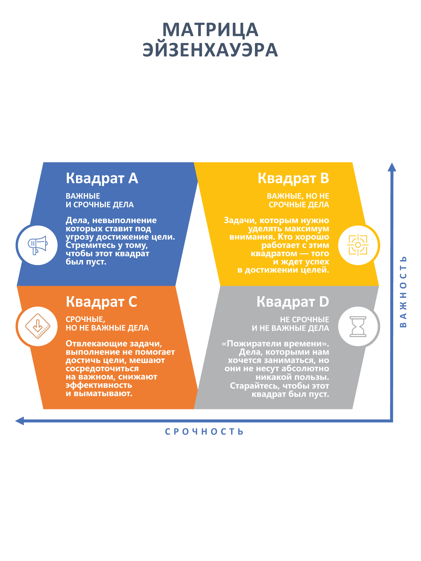 Е – решения. Установите приоритеты. Принимайте решения о приоритете своей деятельности. Что для вас самое важное, что самое срочное? Где вы можете что-то сократить или делегировать другим?