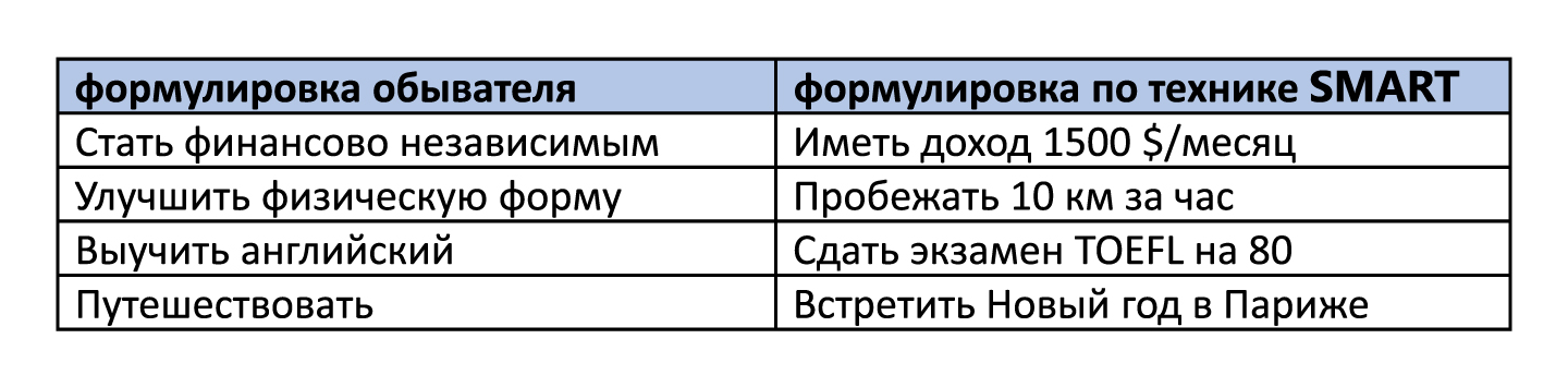 Мы конкретизируем желаемый эффект в нашей личной жизни, делая его понятным и достижимым. Вместо мечтательных, общих формулировок нужно записывать конкретные результаты, которые хотим получить в итоге.