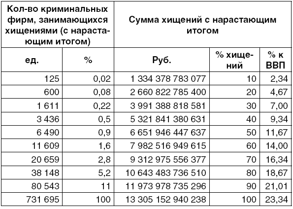 Всего было выявлено 15,5 трлн.руб. хищений (из которых 13,3 трлн.руб. относятся к четко установленным юридическим лицам, а 2,2 трлн.руб. к 233 565 пока не идентифицированным расчетным счетам). Иначе говоря, половина вскрытых хищений оказалась на совести менее одного процента выявленных криминальных фирм! Далее – полтора процента выявленных криминальных фирм украли 60%, менее трех процентов украли 70%, примерно пять процентов фирм украли 80% и, наконец, 90% выявленных хищений приходится на 11% выявленных криминальных фирм. Оставшиеся же 89% мелких компаний – а это 651 152 юридических лица – украли не более 10% от всех выявленных нами хищений.
