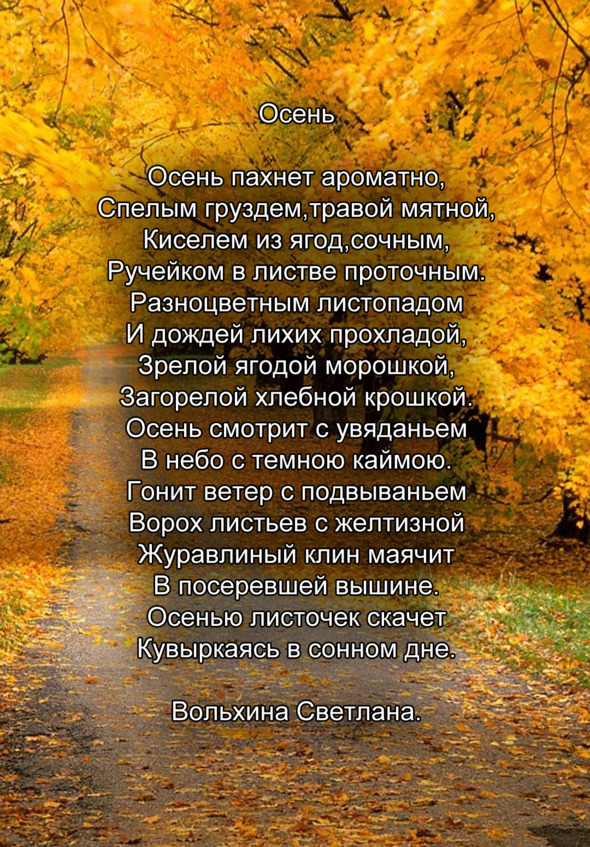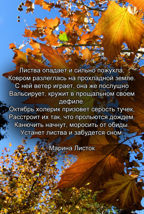 Разве не слышишь о чёмОсень поет печально?Молкнет за шумным дождемАвгуста шепот прощальный.Шелестом губ сентябряКаждый наш шаг наполненАлым огнем горят листья в дуэте с golden.Наш край