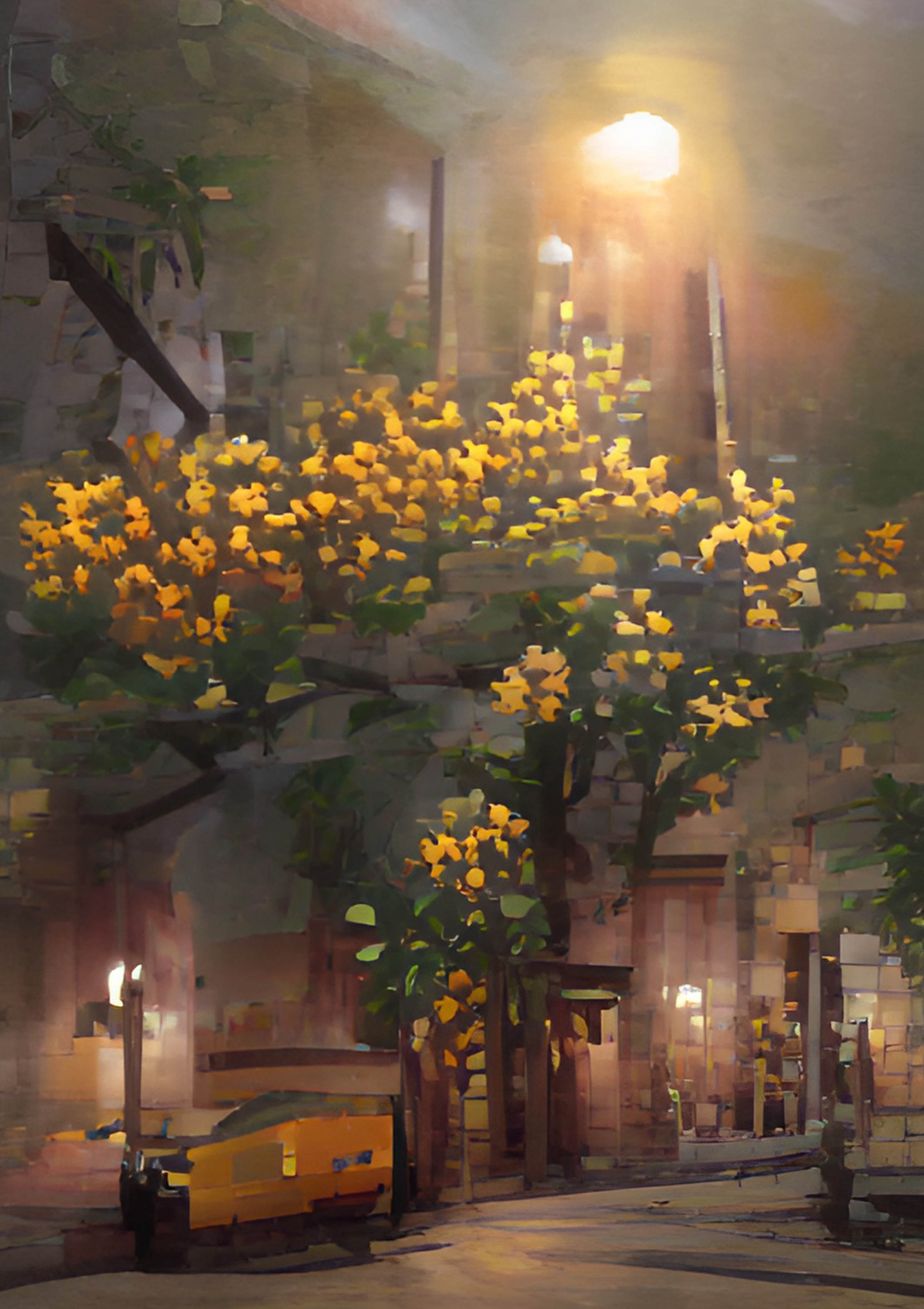 При этом цветы на деревьях распускаются и цветут же полгода. Они радуются жаре и блестят всё сильнее под лучами солнца. Бумажными розовыми цветами; они застыли арками над дверьми, на балконах. Наклонившись, тычинками в форме звёздочек, смотрящие в глаза прохожих. Обращая внимание на себя еще издалека, пушистыми пятнами возле дорог.