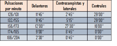 Creo interesante indicar también los resultados de un estudio sobre las frecuencias cardiacas manifestadas por los futbolistas durante una competición. Los valores registrados demuestran que el futbolista no está sometido a tensiones muy elevadas.