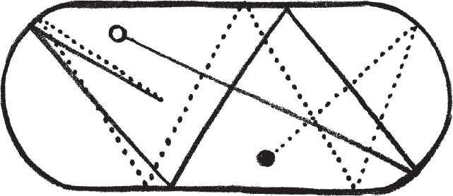Two quickly diverging paths taken by a billiard ball round a stadium-shaped billiard table.