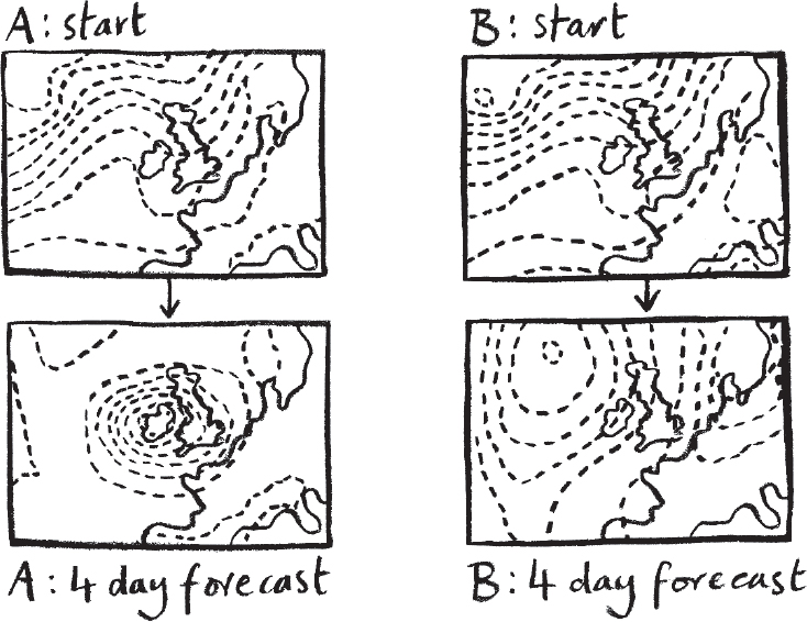Starting from nearly the same conditions, forecast A predicts strong wind and rain over the British Isles in 4 days’ time, while forecast B predicts incoming high pressure from the Atlantic.