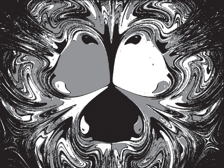 Computer models can produce very good visual representations that give me a handle on the sensitivity of various systems to the starting conditions. Next to my Vegas dice I’ve got a classic desktop toy that I can play with for hours. It consists of a metal pendulum that is attracted to three magnets, coloured white, black and grey. Analysis of the dynamics of this toy has led to a picture that captures the ultimate outcome of the pendulum as it starts over each point in the square base of the toy. Colour a point white if starting the pendulum at this point results in it ending at the white magnet. Similarly, colour the point grey or black if the ultimate destination is grey or black. This is the picture you get: