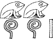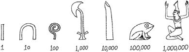 FIGURE 1.07 Ancient Egyptian symbols for powers of 10. 10 is a stylized heel bone, 100 a coil of rope and 1,000 a lotus plant.
