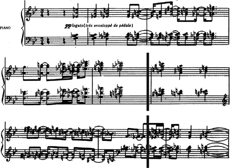 FIGURE 1.04 Messiaen’s ‘Liturgie de Crystal’ from the Quatuor pour la fin du temps. The first vertical line indicates where the 17-note rhythm sequence ends. The second line indicates the end of the 29-note harmonic sequence.