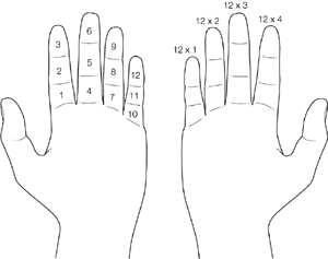 Each finger is made up of three bones. There are four fingers on each hand, so with the thumb you can point to any one of 12 different bones. The left hand is used to count to 12. The four fingers on the right hand are then used to keep track of how many lots of 12 you’ve counted. In total you can count up to five lots of 12 (four lots of 12 on the right hand plus one lot of 12 counted on the left hand), so you can count up to 60.
