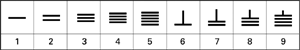 Here are the numbers from 1 to 9 in bamboo sticks: