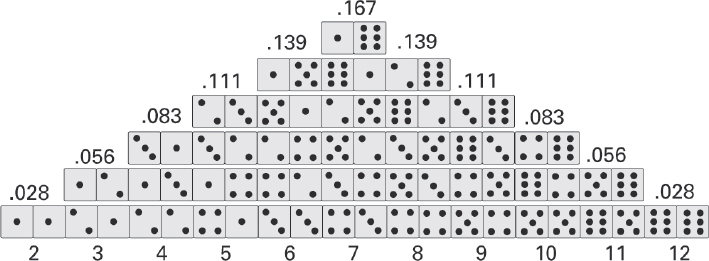 It was in fact the great Italian physicist Galileo Galilei who applied the same analysis that Cardano had described to decide whether to bet on a score of 9 or 10 when three dice are thrown. He reasoned that there are 6 × 6 × 6 = 216 different futures the dice could take. Of these, 25 gave you a 9 while 27 gave you a 10. Not a big difference, and one that would be difficult to pick up from empirical data, but large enough that betting on 10 should give you an edge in the long run.