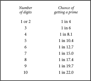 The first number the phone company gave me looked promising, but when I put it into my computer and tested it I found that it was divisible by 7. ‘I’m not sure I’m going to remember that number … any chance of another number?’ The next number was also not prime—it was divisible by 3. (An easy test to see whether your number is divisible by 3: add up all the digits of your telephone number, and if the number you get is divisible by 3 then so is the original number.) After about three more attempts, the exasperated telephone company employee snapped: ‘Sir, I’m afraid I’m just going to give you the next number that comes up.’ Alas, I now have an even telephone number, of all things!