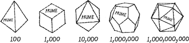 To decide whether each number is going to be prime, roll the dice. If it lands prime side up, then mark that number as prime; if it’s blank side up, the number isn’t prime. Of course, this is just a heuristic model—you can’t make 100 indivisible just by a roll of the dice. But it will give a set of numbers whose distribution is believed to be very like that of the primes. Gauss’s prime number theorem tells us how many sides there are on the dice. So for three-digit numbers, use a six-sided dice or a cube with one side prime. For four-digit numbers, an eight-sided dice—an octahedron. For five, digits a dice with 10.4 sides … of course, these are theoretical dice because there isn’t a polyhedron with 10.4 sides.