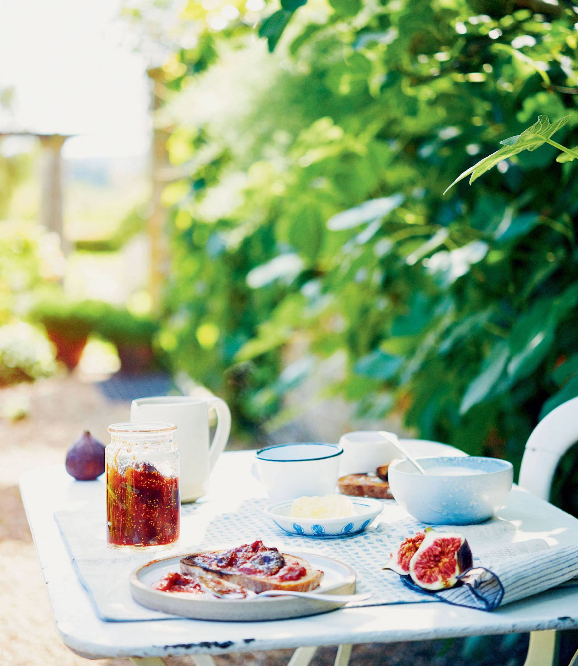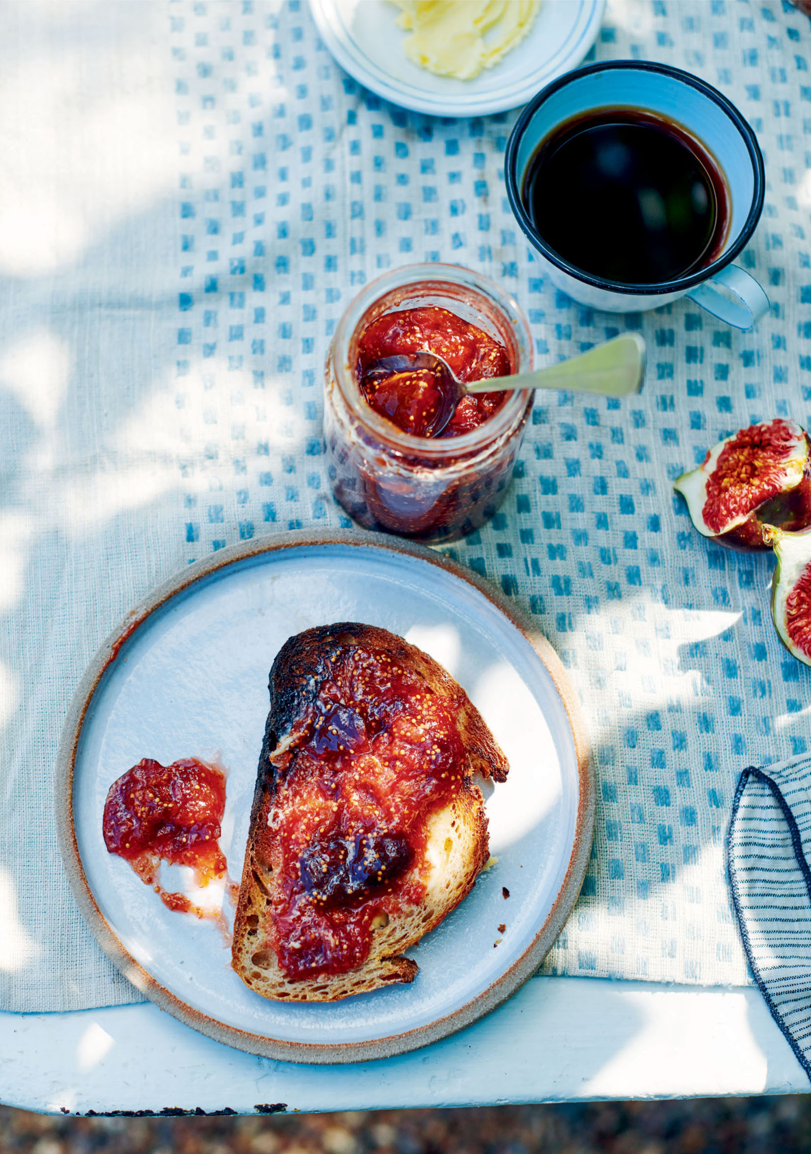 2 Once the liquid begins to come out of the figs, turn the heat up a little and stir regularly to prevent the jam catching on the bottom of the pan. Simmer rapidly until the jam reaches 105º. If you don’t have a thermometer, use the saucer test: put a saucer in the freezer, then once it’s cold put half a teaspoon of the jam on the saucer. If it does not run, it’s ready.