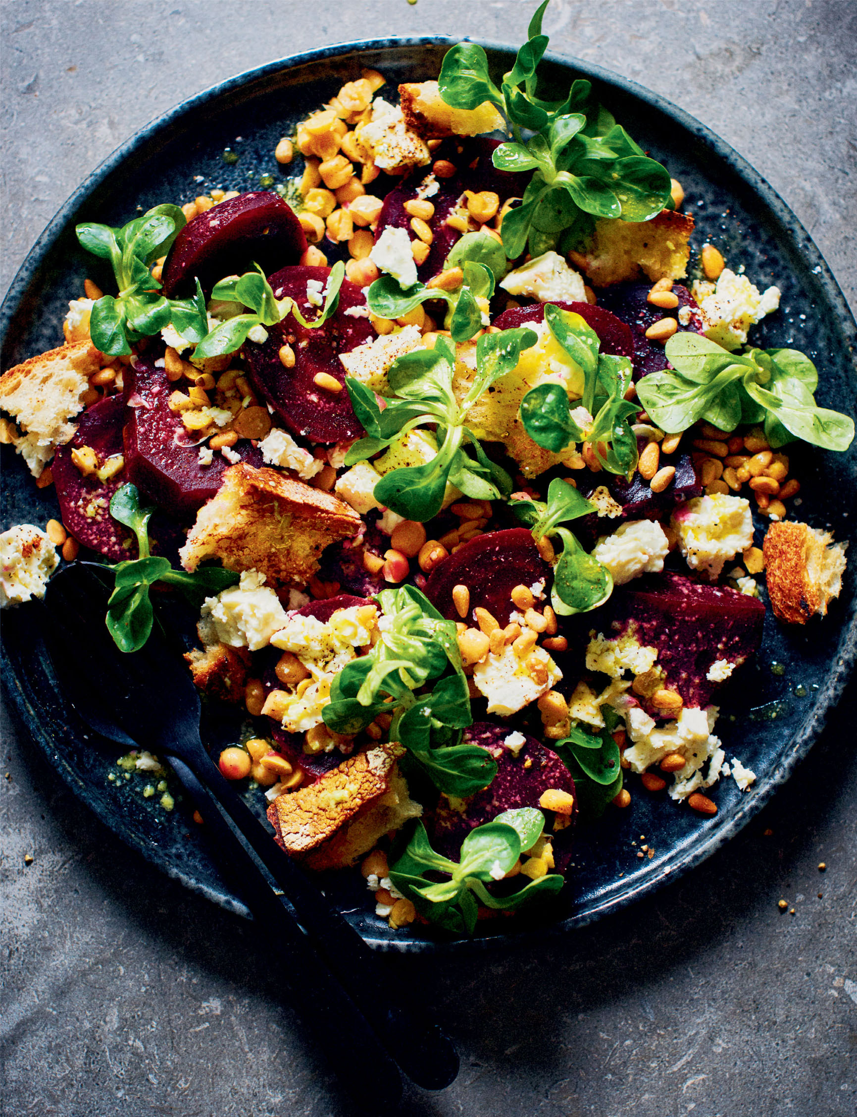3 Slice the beetroot into large chunks and lay them on a platter. Scatter the chopped chickpeas on top, followed by the lamb’s lettuce. Crumble the feta on top, then add the pine nuts and a generous grind of black pepper. Finish with the torn sourdough pieces.