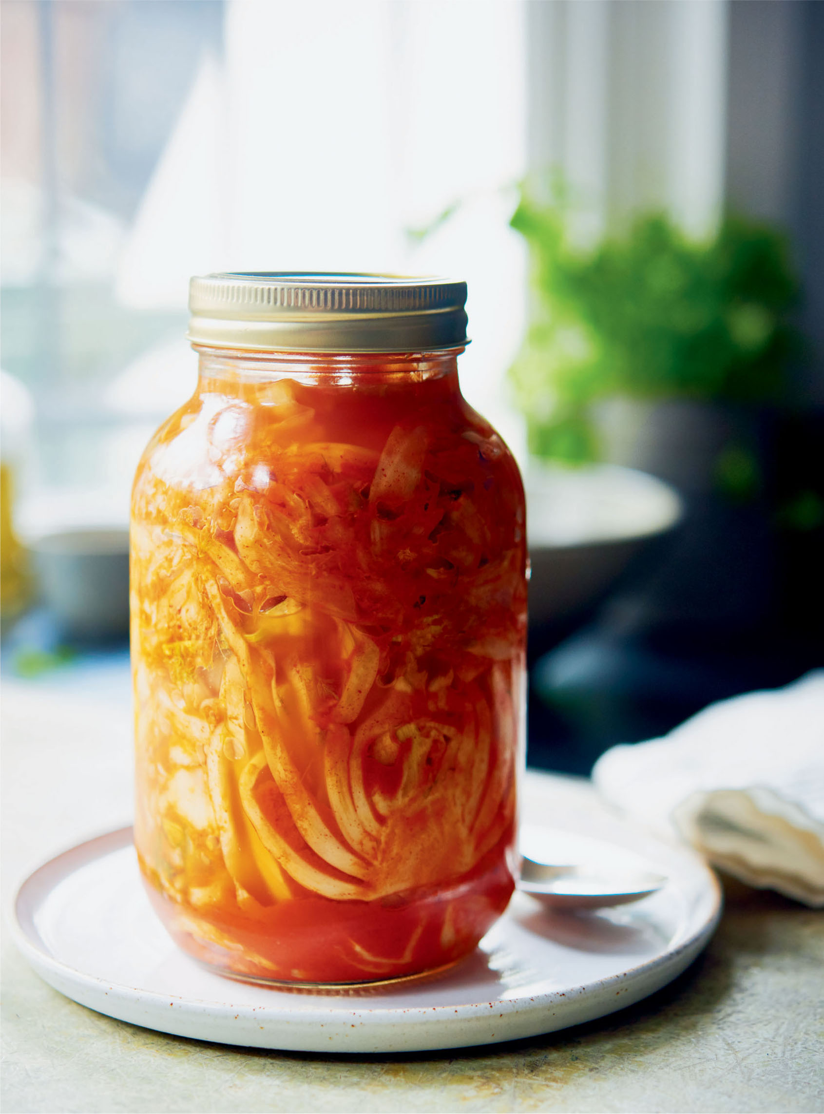 Fermentation is an age-old preservation method that has had somewhat of a resurgence of late. It’s a little more adventurous, and is something everyone should try. It’s good for your gut, too. A lot of items we consume daily are actually a product of fermentation, such as cheese and wine. Kimchi is Korean in origin and is a spicy, fermented cabbage. It is great to shred up and use in salads, on burgers, in frittatas and in toasted sandwiches.