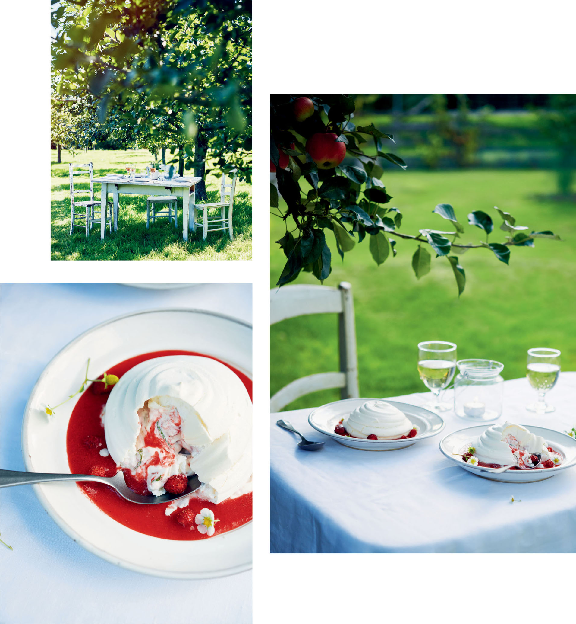 4 Bake in the oven for 40–50 minutes until crisp on the outside, but still soft in the centre. Turn off the oven and leave the door ajar until the meringues are cool to touch. Very gently, scoop out the soft meringue with a spoon, leaving the shell intact. Set the soft meringue aside.