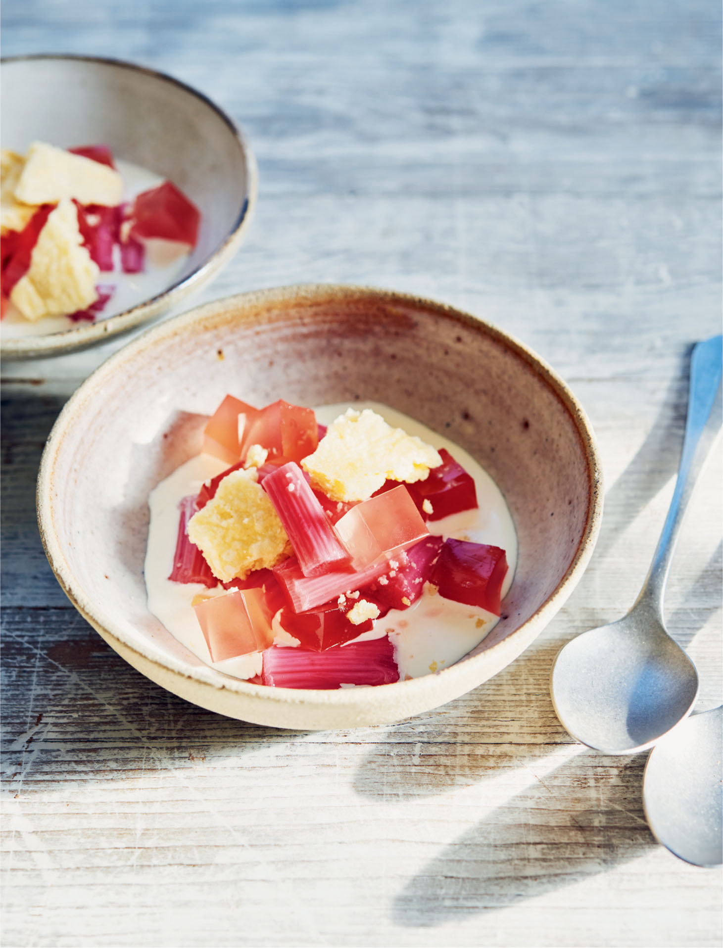 6 To serve, divide the the cream and rhubarb pieces among 6 bowls. Top with the jelly and shortbread pieces.