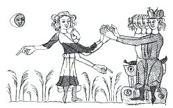 На рисунке XIV века (рис. 9) мы видим одного из таких вассалов или арендаторов феодала с пятью руками. Две его руки, сложенные вместе, вложены в руки сидящего перед ним господина. Еще одна рука, указывающая на него самого, означает, что он – «человек» своего господина. Двумя оставшимися руками он указывает на хлебное поле, символизирующее его «лот», или землю, за пользование которой он в присутствии двора отдает себя в вассальную зависимость от хозяина. Это был своеобразный обряд, посредством которого человек объявлял, что он стал «человеком» другого. Эта церемония – оммаж – была одним из самых важных обрядов, совершаемых в период, когда в Европе процветали феодальные отношения. Истоки этого обряда частично можно обнаружить у поздних римлян и германцев, когда люди отдавали себя под защиту и покровительство человека более сильного и богатого, чем они сами. В IX веке мы видим, как такой человек, оставшийся без средств к существованию, обращается к некоему могущественному господину: