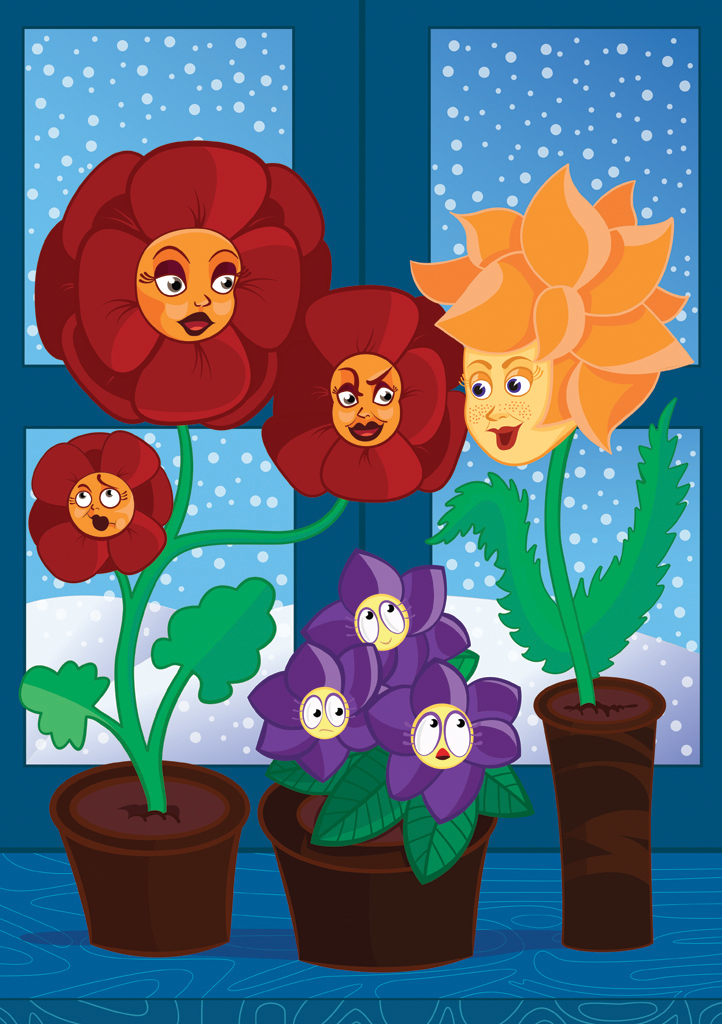 Всё вокруг было такое необычное, такое красивое: печка тёплая в расписных изразцах, стол дубовый с лавочкой, а под ней на полу крошки хлебные, два окошка со светлыми тюлевыми занавесками и белёными подоконниками, а на них горшки с цветами. На одном окошке цвела красная-прекрасная герань, набирала бутоны фиалка, тянулась к свету бегония, а на другом стоял маленький чахлый кактус, один-одинёшенек…
