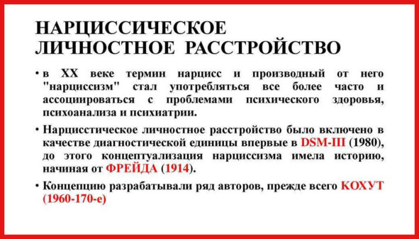 Диагностическое и статистическое руководство по психическим расстройствам (DSM-5) определяет нарциссическое расстройство личности как состояние, характеризующееся раздутым чувством собственной важности, глубокой потребностью в чрезмерном внимании и восхищении, а также отсутствием эмпатии к другим.