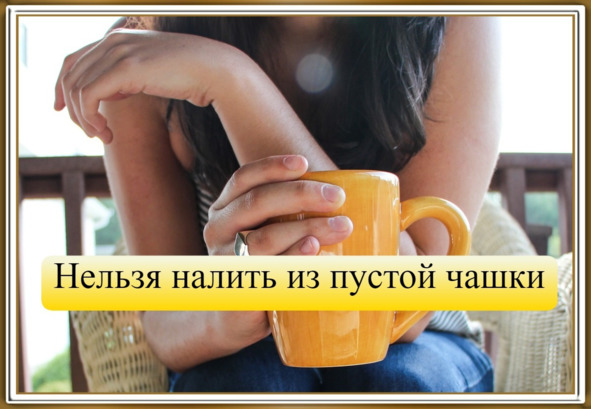 Возможно, вы слышали поговорку: «Нельзя налить из пустой чашки». Попытка жить жизнью, базирующейся на том, что нужно другим людям, утомительна. Это истощает вас физически, умственно, эмоционально и духовно. Если вы не делаете ничего, чтобы наполнить свою «чашу», в конечном итоге вы проиграете. Когда вы утомлены, вы не можете полностью присутствовать в своей жизни – ни для себя, ни для людей, которых вы любите. Вы можете почувствовать себя раздражительным, тревожным или злым. Если вы будете делать это слишком долго, вы можете даже заболеть. И это не принесет ничего хорошего – ни вам, ни другим людям.