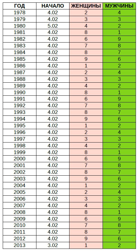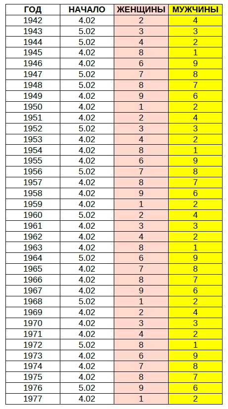 По китайскому календарю, год начинается 3-5 февраля. В табличках я отметила дату начала года. Если вы родились до этой даты, ваше ГУА – предыдущего года.