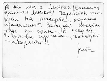 Подпись на обороте: «А это мы с Леньком (Сашкина фамилия Леньков) чарльстон танцуем на концерте, хорошо принимают. Завтра поедем еще на один, в школу, Т. Чернова просила, говорит – покормят!! Рита»