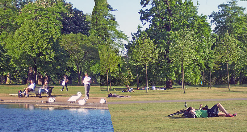 Парк здесь ухоженный, тенистый, но странно, что на зелёных лужайках и в тени дерев никого нет. Нет желающих полежать на траве, посидеть? Похоже, что нет. Или непозволительно? Мы оглядываемся, ищем подтверждения нашим догадкам в виде запрещающих знаков, но не находим. Китайцы передвигаются исключительно по асфальтовым дорожкам, а сидят на скамеечках. Да, это тебе не в парках Лондона отдыхать, где также всё чисто и ухожено, но люди, птицы и животные как равноправные дети природы гуляют, сидят и лежат, где хотят.