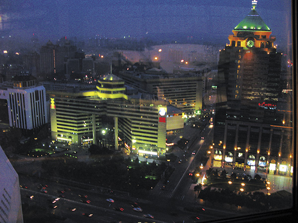 С высоты птичьего полета обзор был очень хороший, но Пекин спрятался под густым облаком смога и видимость оставляла желать лучшего. Солнце быстро садилось. С наступлением темноты зажглись фонари и сквозь дымку мы увидели ночной Пекин. Какой он? Красивый и экономящий электроэнергию :-)
