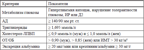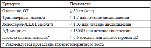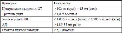 В отличие от критериев ВОЗ, Американская национальная образовательная программа по холестеролу (NCEP/ATPIII), исключила диабет 2-го типа из критериев МС. Согласно данным этой программы, для диагноза МС необходимо наличие, как минимум, трех из пяти ниже представленных признаков (табл. 2).