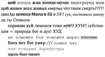 Большая хорошая квартира. Внутри – белоснежные стены, импортные вещи и вещички, вполне культурные люди. Снаружи – каракули весны. Надписи, записи, подписи, перекрывающие подъездные стены на последнем, четвертом этаже, а также вековые мудрости, мат на мате.