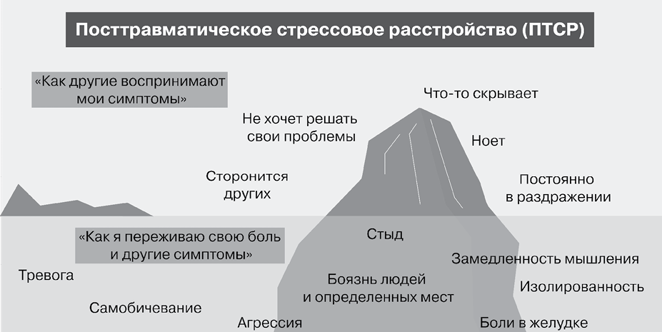 Внимательно посмотрите на рисунок – на нем хорошо отражено, как другие воспринимают симптомы человека с ПТСР и как он сам переживает свою боль и страдания, что при этом испытывает. На рисунке наглядно видно, что ухудшается здоровье человека, как физическое, так и психическое. Жизнь для него становится невыносимой.