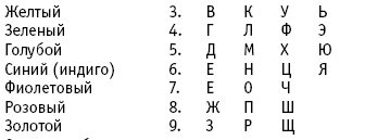 Схема основных цветов спектра с числовым и буквенным соответствиями: