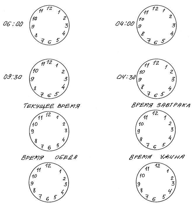 Перед вами рисунок, на котором изображены циферблаты часов. Вам следует на них дорисовать стрелки в соответствии с указанным временем, а также указать текущее время, время завтрака, обеда и ужина.