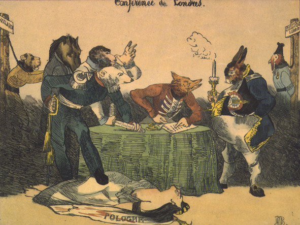 Литография о Лондонской конференции 1830 года кисти Оноре Домье. Фигуры, представляющие Пруссию, Австрию, Россию, Великобританию и Францию, показаны обсуждающими текст, в то время как Голландия и Бельгия висят в стороне, а Польша лежит мертвая на земле.